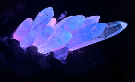 Large crystals of natural transparent stone rock crystal, transparent quartz in crystals, rock, magical rites, esotericism. Pink, blue laser colors through transparent stone on black background.