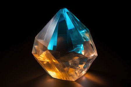 A mesmerizing crystal captures light with vibrant reflections of blue and orange hues. Perfect for art, decor, or nature-themed projects, this unique piece radiates elegance.