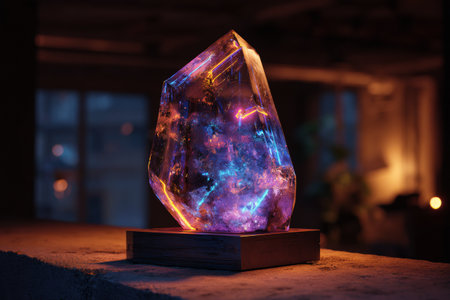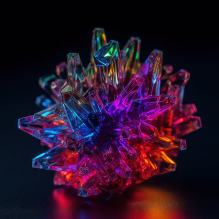 Iridescent crystals on illuminated podium, creating a mesmerizing display with vibrant reflections