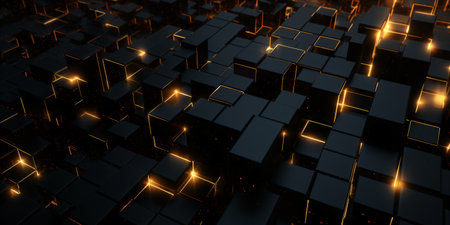This image features a collection of dark cubes with a grid pattern, illuminated by glowing orange light. The composition highlights geometric shapes and textures, possibly suggesting a digital or technological setting. It might be used for projects related to data visualization, networks, or other futuristic themes. The lighting creates visual depth.