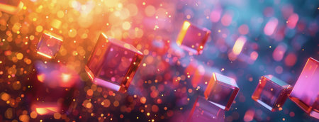 An enchanting abstract scene featuring colorful floating cubes amidst sparkling particles and a vibrant neon background, perfect for creative projects.