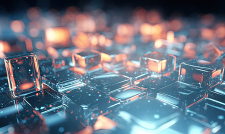 Abstract digital art featuring glowing metallic cubes, creating a futuristic cityscape. The image showcases technology and design.