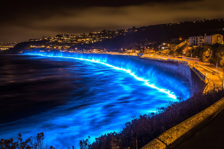 A nighttime view of a city skyline and the ocean glowing with bioluminescence.