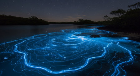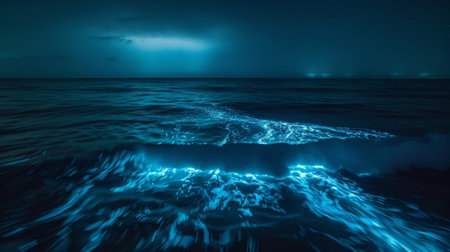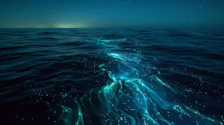 Nighttime image of bioluminescent plankton on the sea surface, creating a starry effect in the dark waters,
