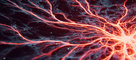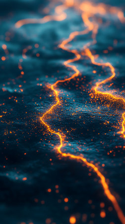 This abstract image captures electric currents creating glowing lines against a dark background, showcasing vibrant reflections and dynamic energy patterns.
