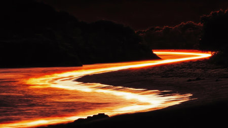 Mesmerizing Flow of Lava Illuminating Dark Beach Serenity in Stunning Landscape.