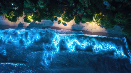 Glowing bioluminescent waves crash on a dark beach at night, creating a magical and surreal scene.
