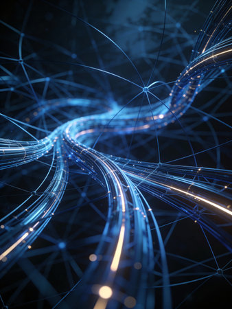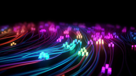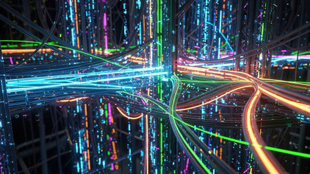 Digital showing digital network of colorful fiber optic cables and data streams. High resolution image. Clear details and vibrant colors enhance visual appeal.