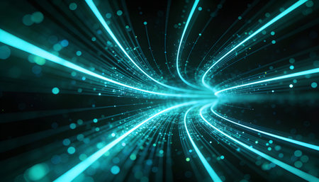 Exploding wave of luminous blue particles in motion against a dark background, resembling data streams or energy flows.