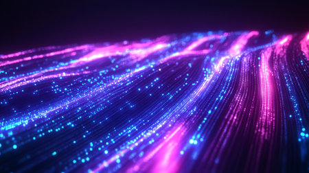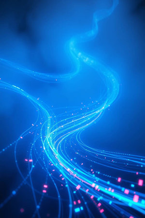 This image features glowing curved lines in shades of blue, teal, and magenta, resembling data streams or waveforms. The abstract and futuristic concept emphasizes motion, energy, and technology.