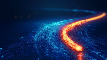 A luminous digital corridor with flowing binary sequences forms a high-tech pathway, evoking a visionary network of information in motion.