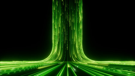 3d render, abstract wallpaper. Green neon lines over black background. Streaming energy. Particles moving and leaving glowing tracks