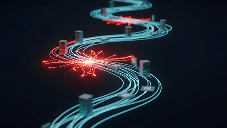 A winding path of glowing blue fiber optic cables connects server racks with vibrant red data...