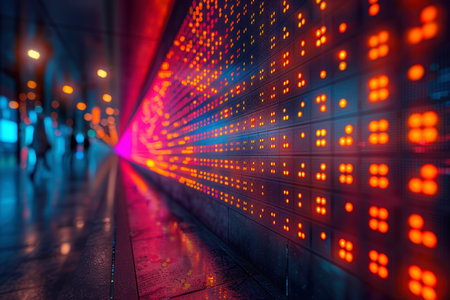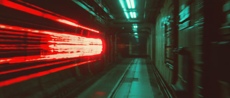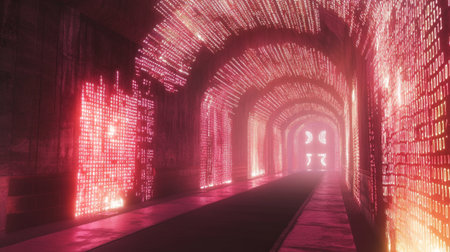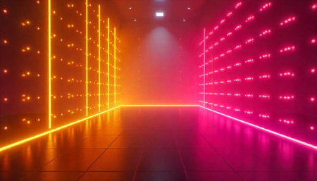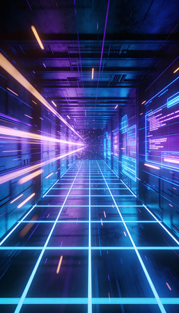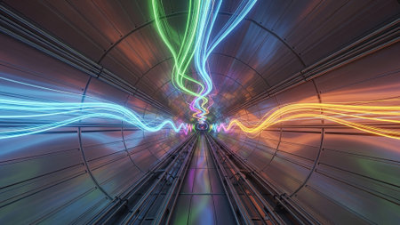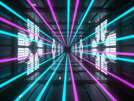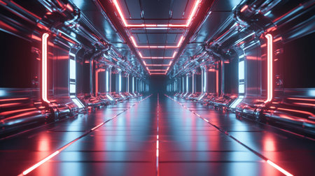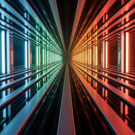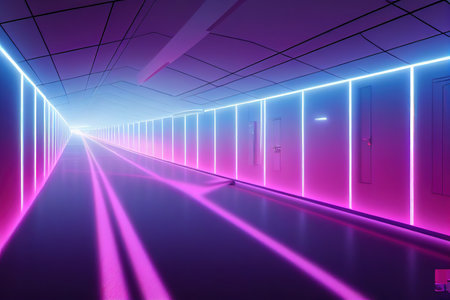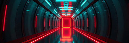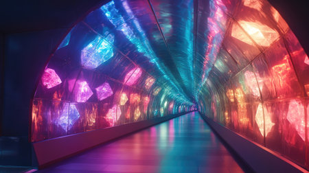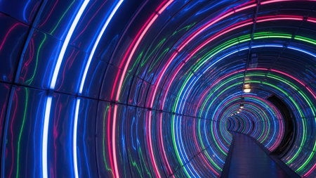 A futuristic tunnel with vibrant neon lights and a sleek metallic design