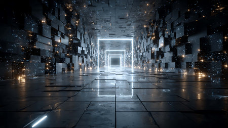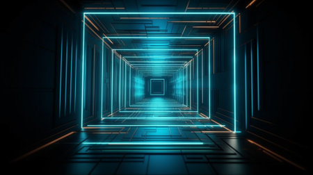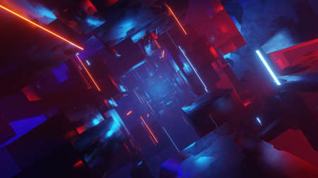 Inside the space tunnel, neon lights, space futurism in cubic forms, Illustration Abstract 3d Render