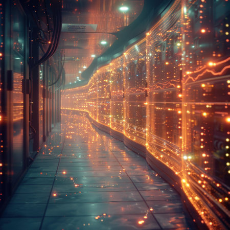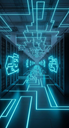 A futuristic server room with neon blue lines and circuit boards illuminated in the dark