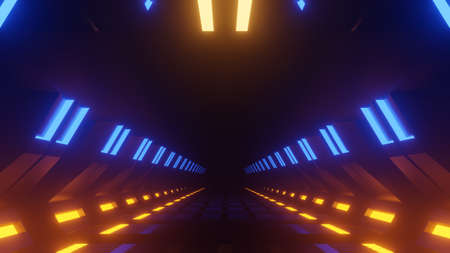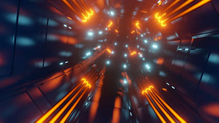 Dark tunnel illuminated by neon orange blue lights. digital space. Cyberspace decor element. motion background. 3D rendering