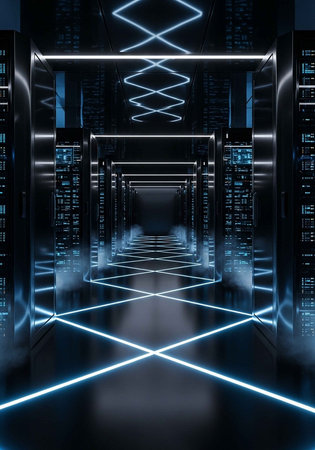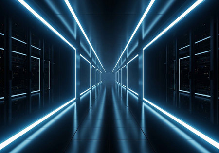A futuristic server room with blue neon lights illuminating rows of computer servers in a dark data center