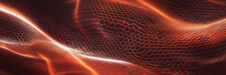 abstract sci-fi background with glow particles form curved lines, surfaces, hologram structures or virtual digital space. Red motion design background of microworld or cosmic space. Strings 35