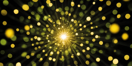 Stunning visual of radiant light beams emanating from central point, creating sense of depth and movement. golden particles enhance dynamic feel, evoking sense of wonder and energy