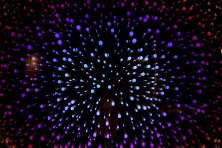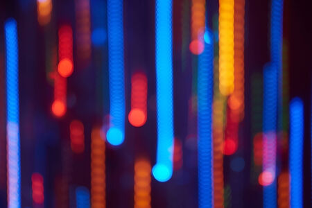 Abstract background of colorful lines in motion on black. Bokeh of defocused splashes, blurred red and blue neon leds, fireworks and salute, space and sky backdrop