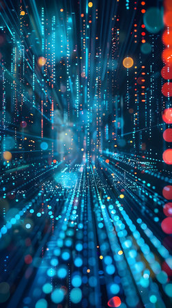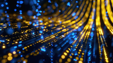 This captivating abstract image showcases a mesmerizing flow of blue and gold lights, symbolizing the dynamic world of digital data and technology.