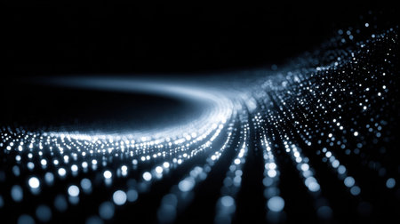 This mesmerizing image features a flowing light trail made up of glowing particles set against a dark background, symbolizing innovation and digital technology.