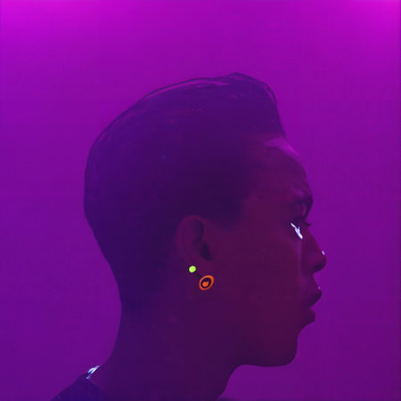 A profile view of a person in a dark, neon-lit environment, bathed in purple light. The person has neon-colored earrings, including a bright green dot and a circular design. The lighting highlights the contours of their face, creating a striking contrast against the dark background.