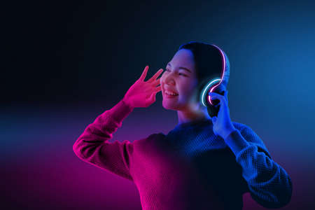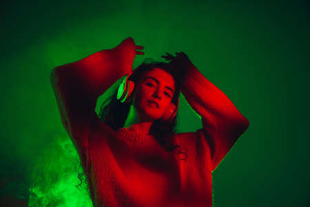 Gorgeous lady with dyed hair listening music in headphones and singing with neon light background. Charming hipster girl dancing with eyes closed.