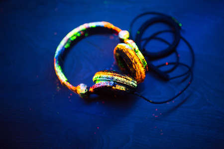 Dj music club concept. Close up old vintage headphones on dark background with colorful light. Selective focus