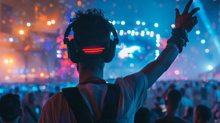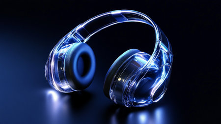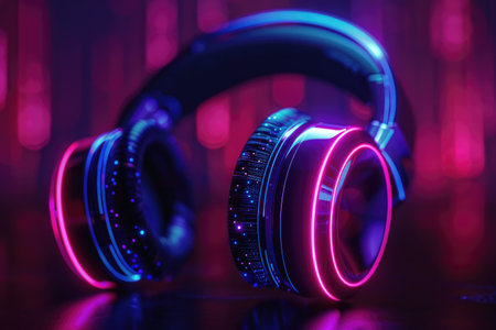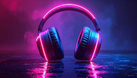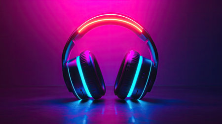 Headphones with vibrant neon glow against a dark background, signifying music and modern sound technology AI