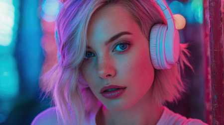 A young woman with short blonde hair wears white headphones and poses confidently against a vibrant neon backdrop. This lively scene captures the essence of urban nightlife.