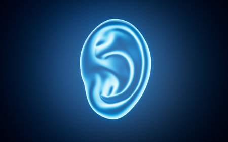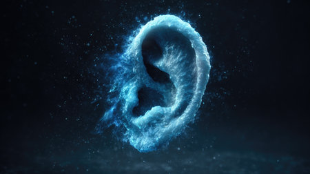 This abstract illustration features a detailed ear rendered in a glowing, electric-blue color. The artwork showcases dynamic particle effects and a dark, atmospheric backdrop. It may be useful for visual content related to sound, hearing, and the human body, suitable for various commercial and editorial projects.