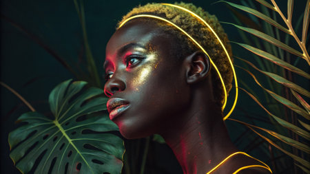 Emphasizing the striking contrast between the skin tone and the gold leaf this portrait showcases a persons features illuminated by bold neon hues creating an ethereal glow around.