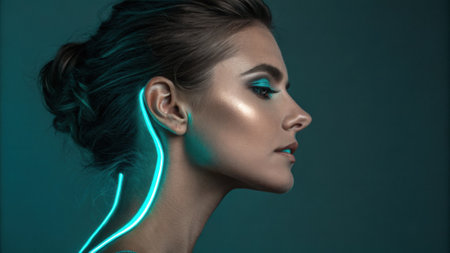 A captivating side view where the profile is accentuated by brilliant turquoise neon accents along the jawline leading to an illuminating effect that enhances the facial features.