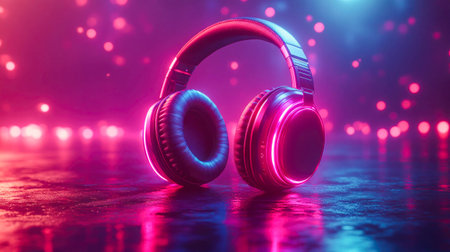Headphones with a neon light glow in 3D rendering. Intense, colorful illumination of the music playing, creating an electrifying visual effect.