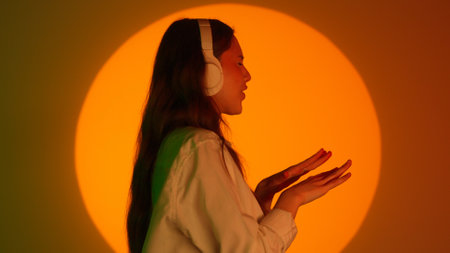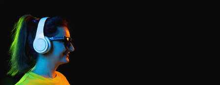 Stylish young woman in casual clothing listening music in headphones and dancing. Isolated on colorful studio background yellow spotlight.