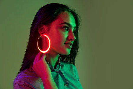 Young beautiful girl with fashion neon accessories, jewelry isolated over light background. Concept of beauty, digital fashion style, creativity