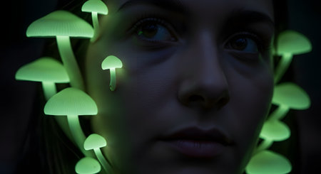 A dark and surreal artistic portrait of a woman's face surrounded by glowing green bioluminescent mushrooms. The mystical fungi illuminate her features, creating a fantasy-like image that blends humanity with enchanted nature.