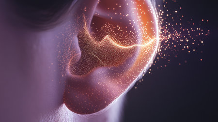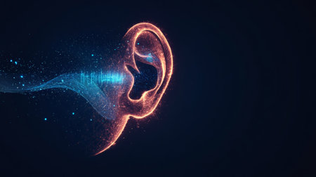 Sound wave entering digital ear, particles flowing towards the auditory canal, creating a futuristic visualization of hearing, music, and audio concepts
