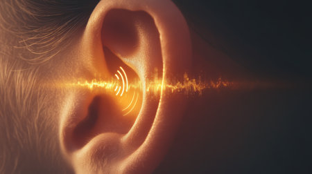 Golden streams of sound waves are entering a human ear, symbolizing the process of auditory perception and the intricate mechanisms of hearing