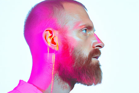 Neon lighting highlights a young man experiencing ear discomfort in a creative studio setting