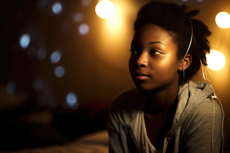 Female African teenager listening to music headphones bedroom. Generative AI AIG23.
