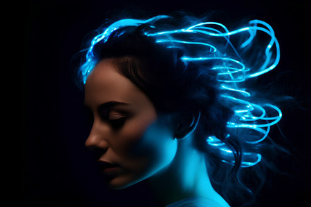 Fantasy portrait of beautiful woman with blue neon lights on her face