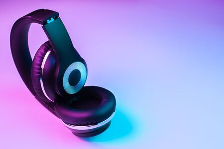 Retro 90s style photo of black stylish wireless headphone in neon lights.