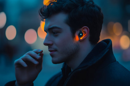 Side view of a young man wearing a glowing wireless earbud outdoors at dusk with blurred city lights in the background
