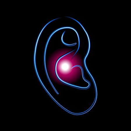 Vector isolated illustration of earache. Neon contour drawing of the ear. ear diseases. Diagnosis of the disease. Otitis. Otolaryngologist.