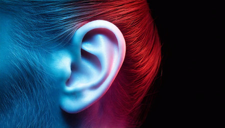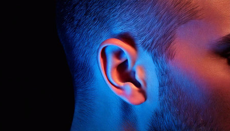 A close-up shot of a human ear, showing detailed skin texture and hearing anatomy with a dark background.
