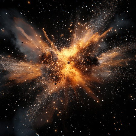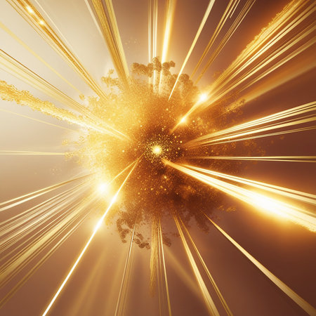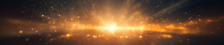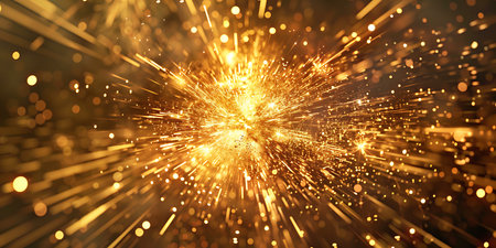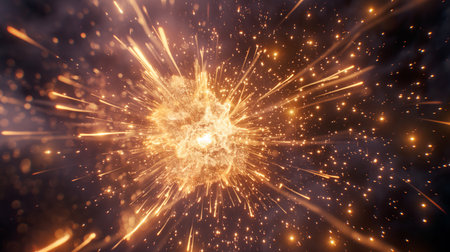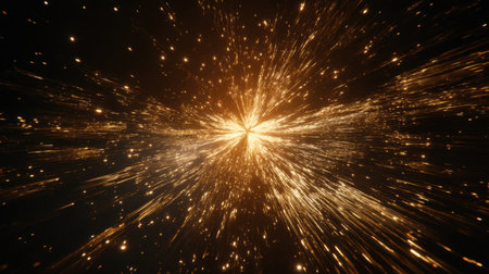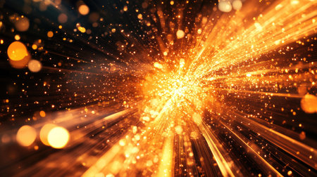 This captivating image showcases a dynamic explosion of golden light in cosmic space, featuring sparkling particles and radiating energy trails, evoking a sense of awe and wonder.