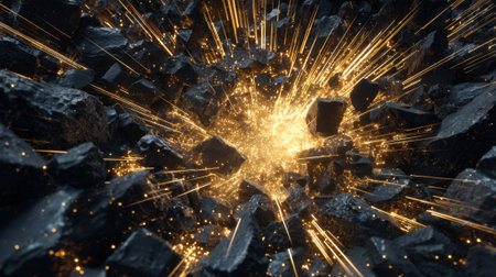 Bright golden sparks erupt from black stones showcasing intense energy and dynamic movement.